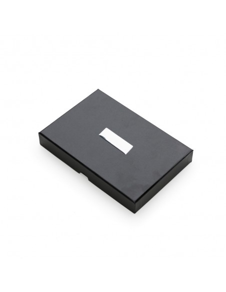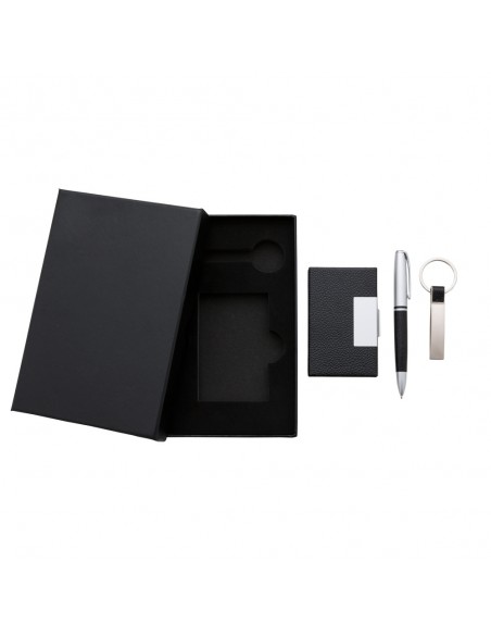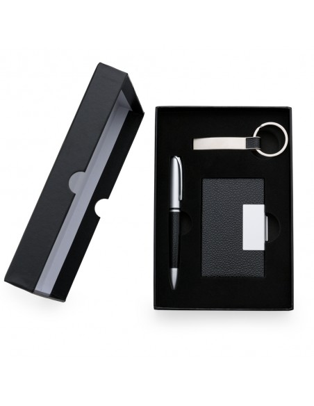 Kit executivo 3 peças em estojo de papelão com tampa e parte interna revestida de espuma. Contém: chaveiro metal fosco com detalhe emborrachado preto, porta cartão de couro sintético(verso metálico liso) com placa de metal e caneta metal fosca com detalhe emborrachado preto. Acompanha placa metálica para gravação.