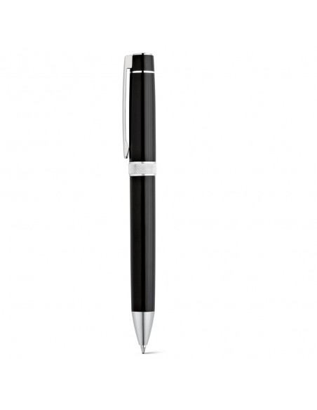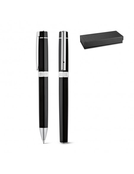 Conjunto de roller e esferográfica com mecanismo twist, ambos em metal e com clipe. Esferográfica até 2 km de escrita. Fornecido em estojo almofadado.
