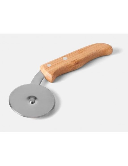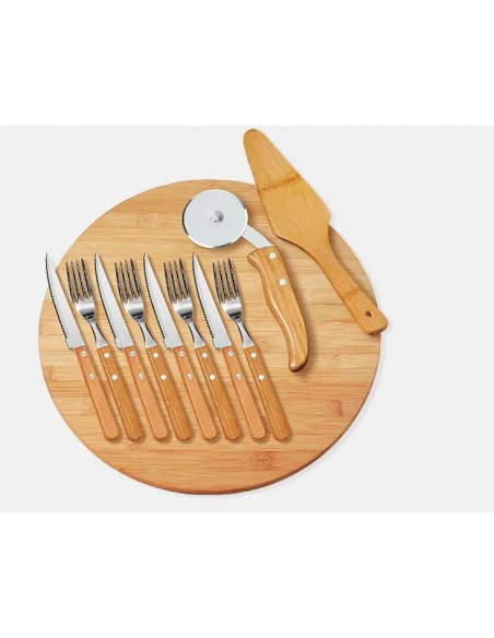 Conjunto para pizza em Bambu/Inox. Acompanha tábua e espátula em bambu; quatro facas de mesa, quatro garfos de mesa e cortador de pizza em Bambu/Inox. Embalagem ideal para presentear.