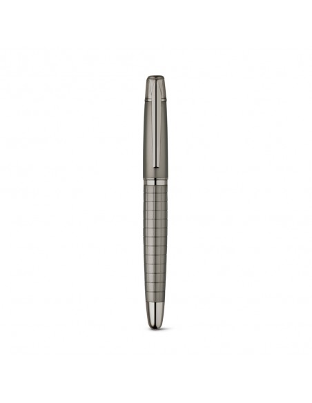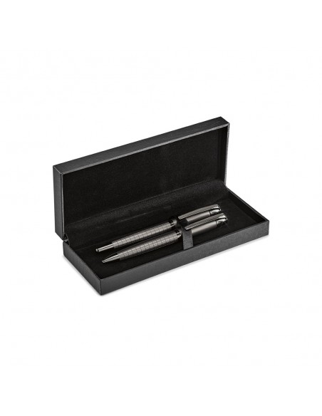 Conjunto de roller e esferográfica em metal, ambos com clipe e escrita preta. Esferográfica com mecanismo twist. Até 1,5 km de escrita. Incluso estojo almofadado.