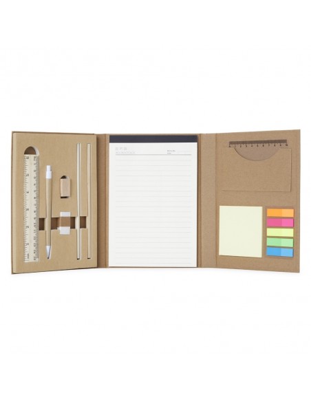 Kit ecológico para anotações, com capa kraft. Contém bloco pautado com aproximadamente 40 folhas marfim, bloco autoadesivo com aproximadamente 25 folhas amarelas, conjunto de 5 marcadores plásticos autoadesivos com aproximadamente 25 folhas, régua plástica 10 cm, régua de madeira 15 cm, borracha, apontador, dois lápis e uma caneta esferográfica azul 1.0mm com acionamento por clique.