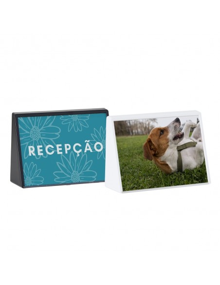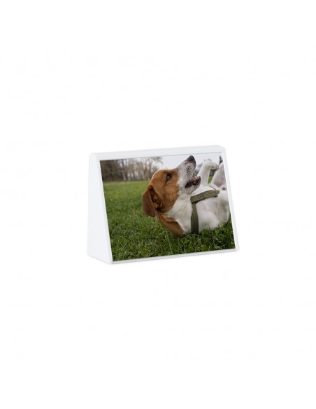 Expositor porta retrato A7 feito em poliestireno com placa acrílica.
