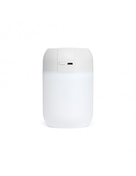 Umidificador de ar com LED, possui reservatório de água com capacidade de 350ml, dois níveis de névoa, contínua e com oscilação. Acompanha filtro de algodão e cabo USB V8.