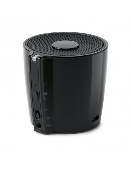Caixa de som em plástico emborrachado com detalhes em poliéster.