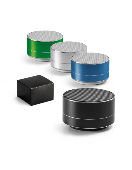 Caixa de som com microfone em alumínio, com transmissão sem fios BT v5.0 e leitor de cartões TF com 3W/4Ω. Autonomia aproximada de 3h. Função para atender chamadas, controle de volume, conexão à playlist do dispositivo móvel e rádio FM. Incluso cabo micro USB para carregar.