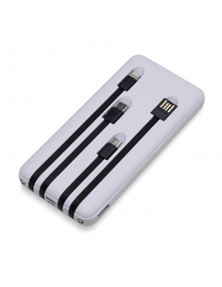 Power bank plástico de 5.000mAh com indicadores led de bateria e cabos acoplados.