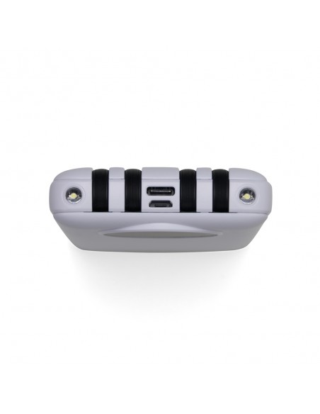 Power bank plástico de 10.000mAh multissaídas com suporte retrátil para celular ou tablet.
