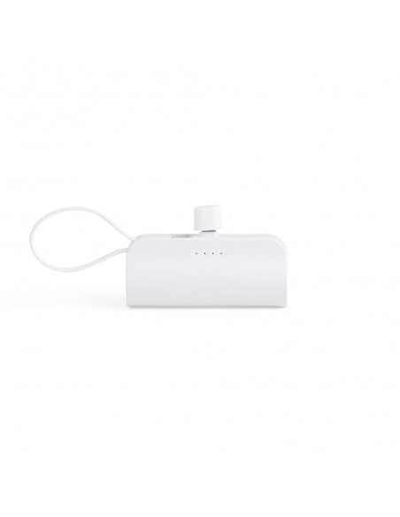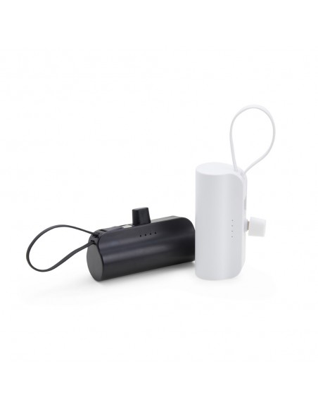 Powerbank 3200 mAh em plástico resistente e revestimento em couro sintético.