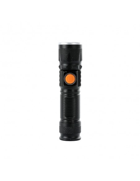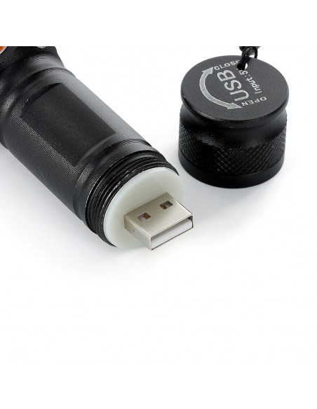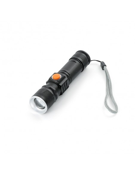 Lanterna led recarregável com zoom de regulagem e três estágios de iluminação, material metálico com USB acoplado para carregamento. Acompanha cordão de nylon.