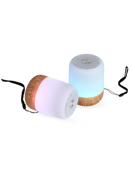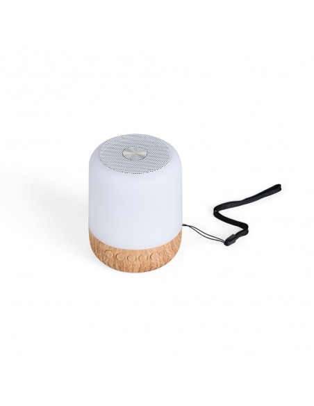 Caixa de som bluetooth em plástico com detalhes em poliéster e alça plástica.