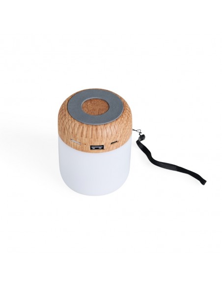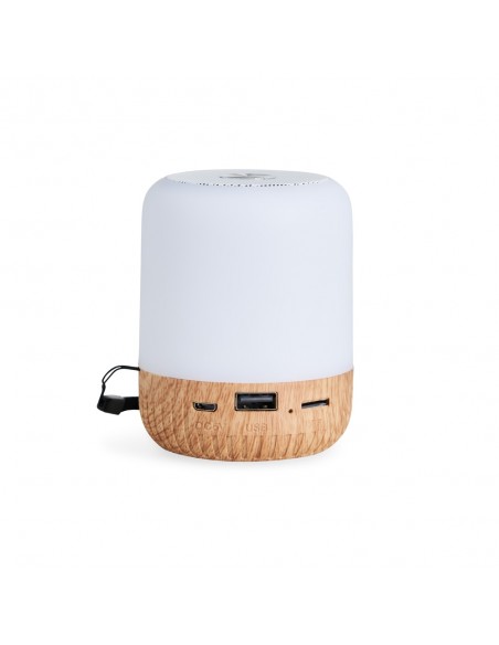 Caixa de som em plástico emborrachado com detalhes em poliéster.