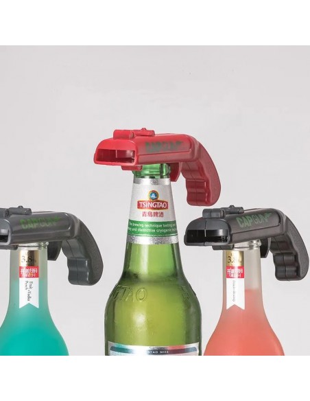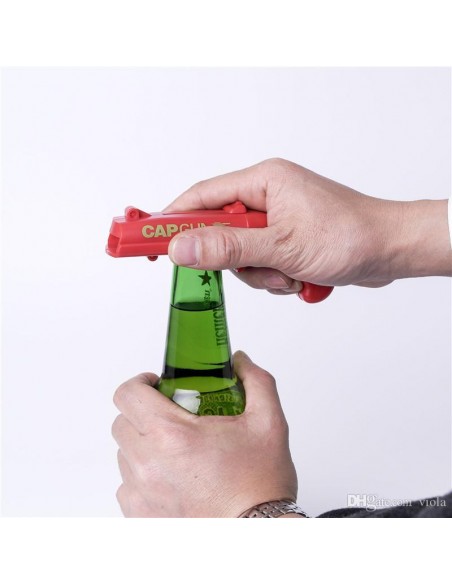Chaveiro alumínio com abridor de garrafa e formato de garrafa.