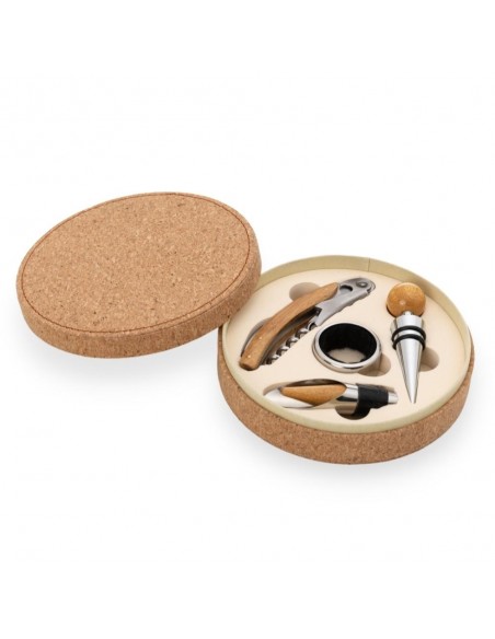 Kit vinho 4 peças com estojo em cortiça, parte interna revestida de espuma.