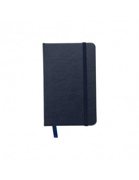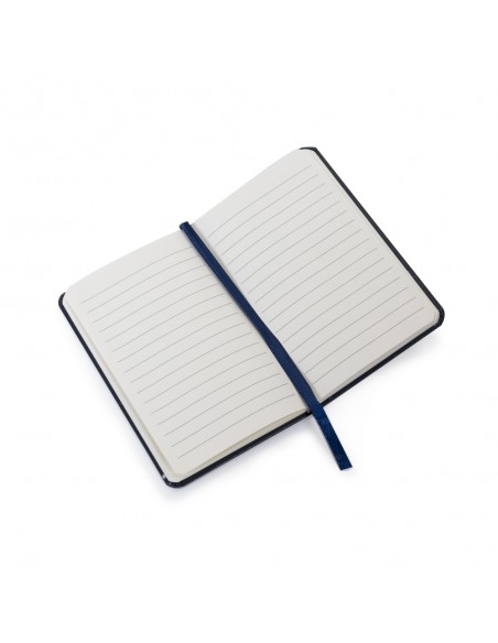Caderneta tipo moleskine couro sintético, marcador de página em cetim e fita elástica para fechar.