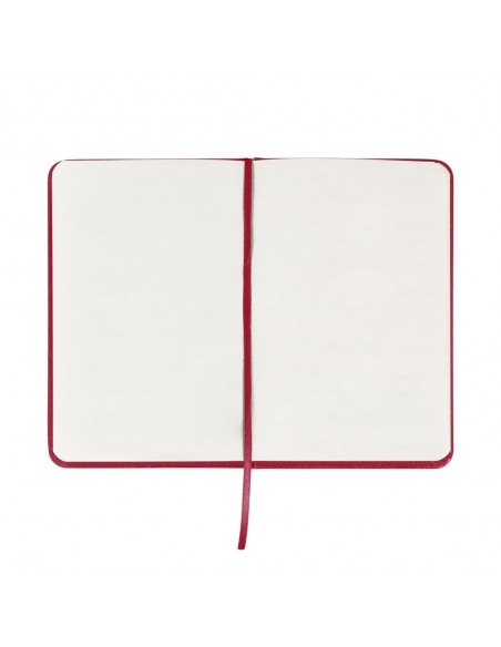 Caderneta tipo moleskine em couro sintético com marcador de página em cetim e fita elástica para fechar.