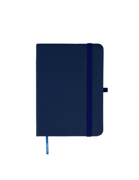 Caderneta tipo moleskine couro sintético, marcador de página em cetim e fita elástica para fechar.