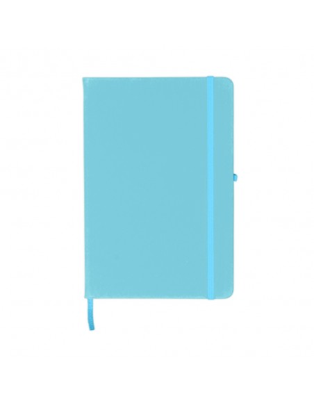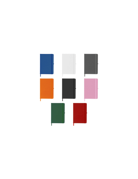 Caderneta tipo moleskine couro sintético, marcador de página em cetim e fita elástica para fechar.
