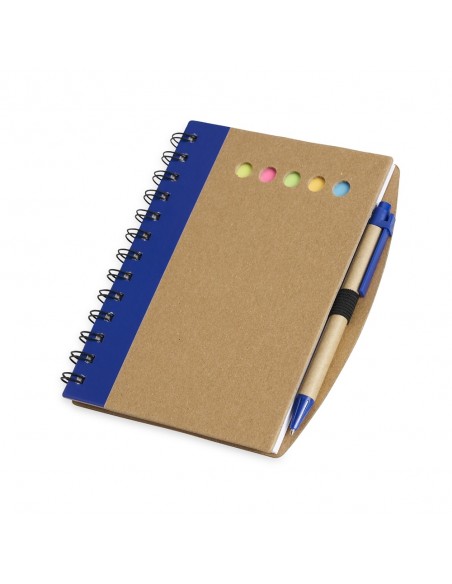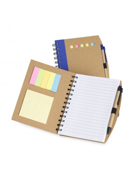 Caderneta com capa em papel com acabamento brilhoso e caneta.