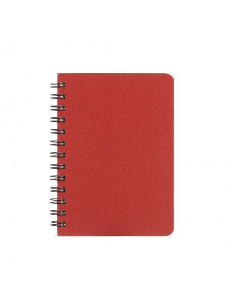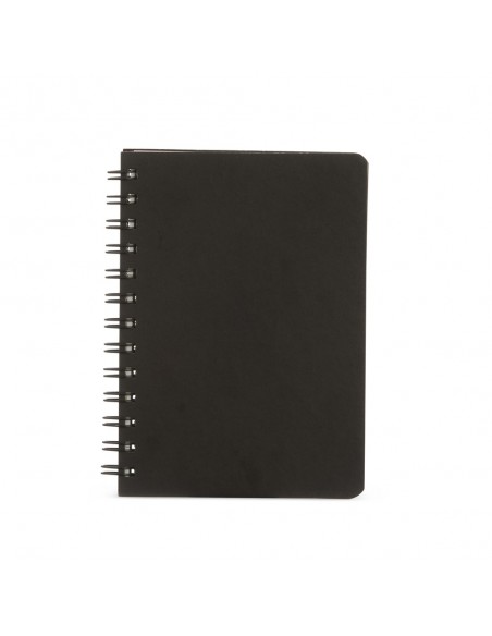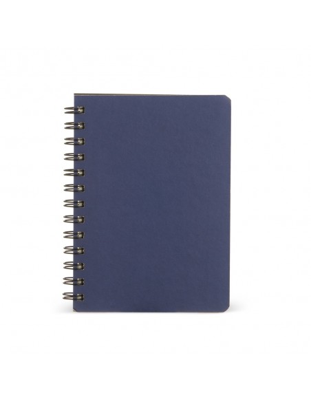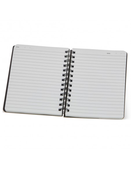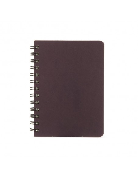 Caderneta capa dura em kraft com wire-o. Contém aproximadamente 80 folhas brancas pautadas.