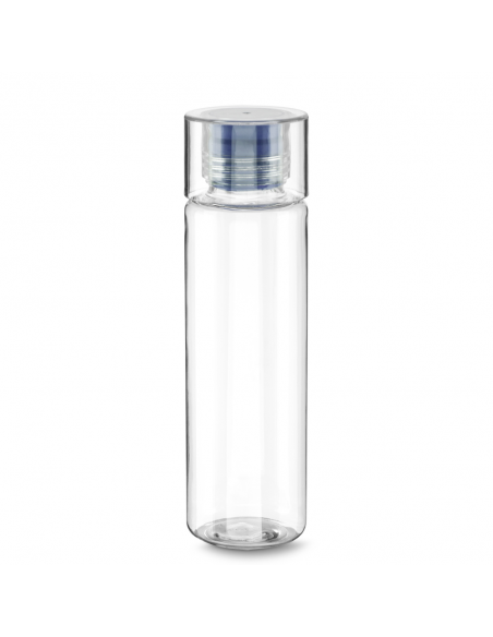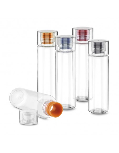 Garrafa plástica com capacidade de até 600 ml com borracha de silicone em cores. Tampa rosqueável. Plástico utilizado AS (Estireno de acrilonitrilo).