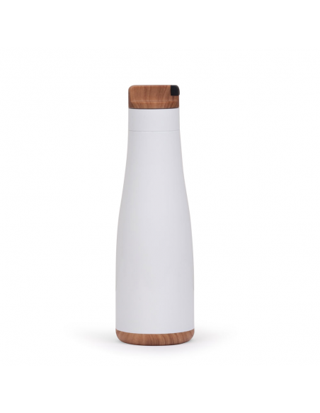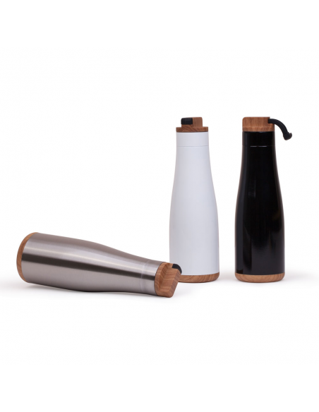 Garrafa em aço inox capacidade 750 ml. Tampa rosqueável anel vedador de silicone, alça retrátil em borracha embutida na tampa. Textura imitando madeira.