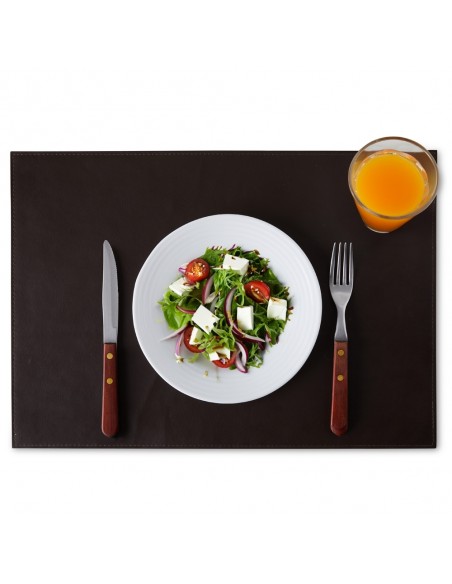 Lugar Americano dupla face, couro sintético. Sendo uma face na cor preto e a outra na cor marrom.