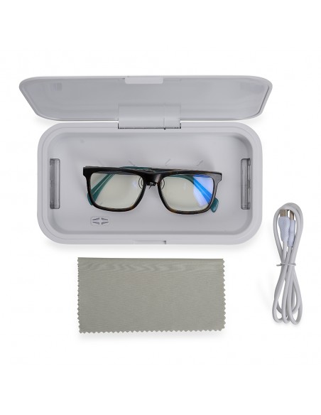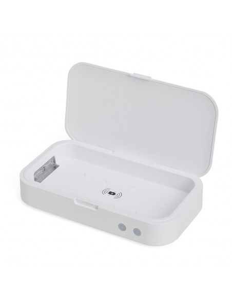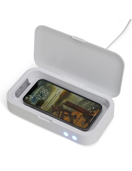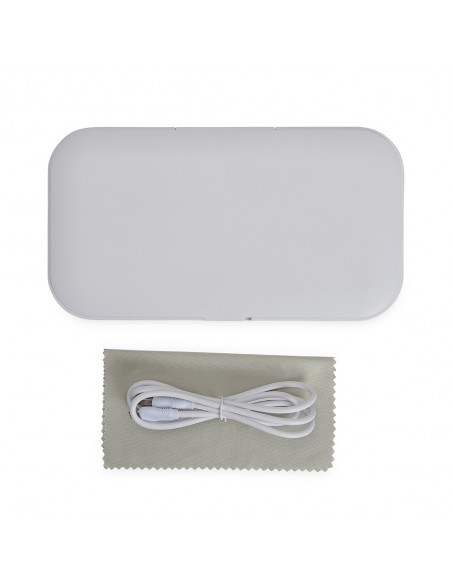 Caixa esterilizadora UV multifuncional. O produto esteriliza objetos através da exposição a luz UV-C, conhecida por eliminar 99% dos vírus e bactérias após um curto período de exposição.