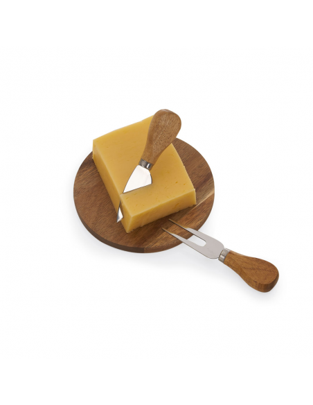 Kit Queijo com 03 peças: Faca, Garfo e Tábua de madeira redonda com 1 cm de espessura.