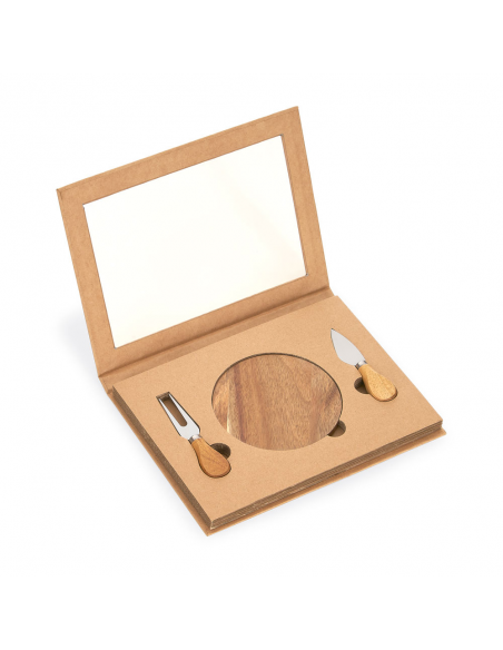 Kit Queijo com 03 peças: Faca, Garfo e Tábua de madeira redonda com 1 cm de espessura. Embalagem presenteável de papel kraft. Obs.: Os componentes de madeira poderão apresentar tonalidades diferente.