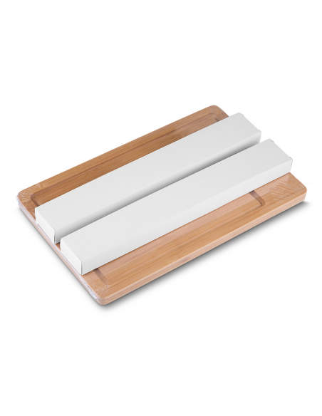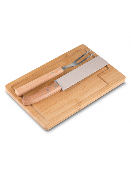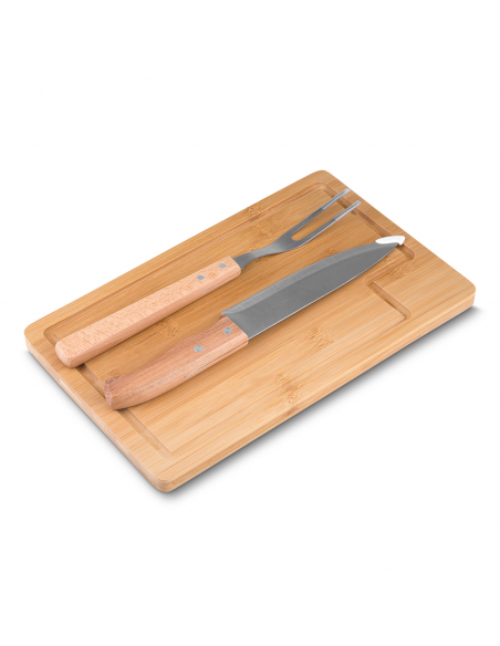 Conjunto composto por uma tábua retangular em tripla camada invertida de Bambu com sulco e duas peças com cabos em Bambu e lâminas em Aço Inox.