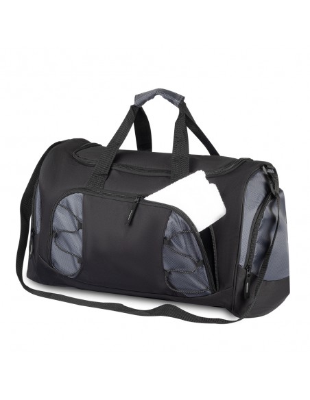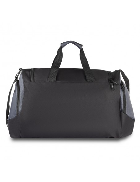 Mala esportiva em tecido poliéster, compartimento interno para roupas e compartimento externo para roupa suja. Na parte inferior da mala possui 4 borrachas de apoio para que a mala não encoste diretamente no chão. Zíper frontal e bolsos laterais, com alça de mão e ombro.