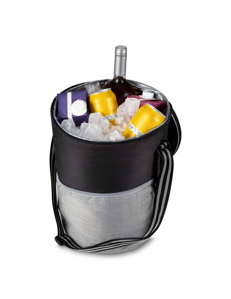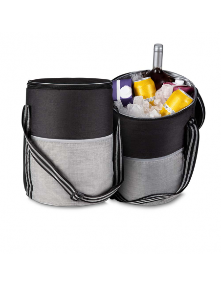 Bolsa térmica, capacidade 25 litros, tecido nylon mescla na cor cinza e grafite, bolso frontal, alça de ombro regulável, parte interna soldada = retém liquido, gravação bolso frontal ou tampa.