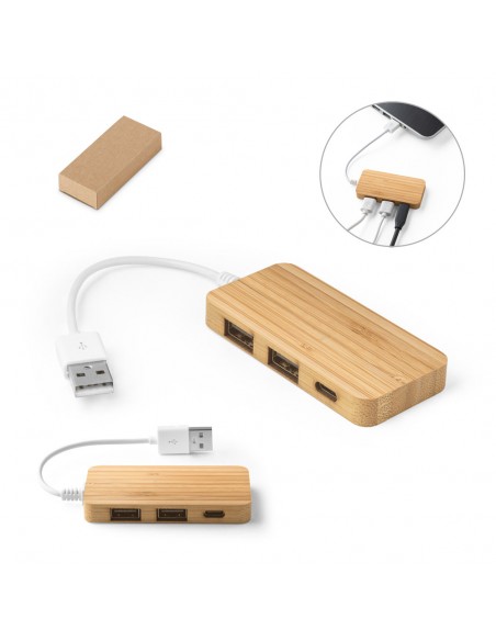 Hub em bambu com 2 portas USB-A e 1 porta USB-C. Permite transferência de dados. Fornecido em caixa presente de papel kraft.