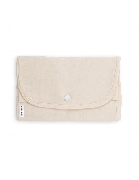 Sacola dobrável em algodão (140 g/m²) composta por 50% algodão e 50% algodão reciclado, com alças de 38 cm.