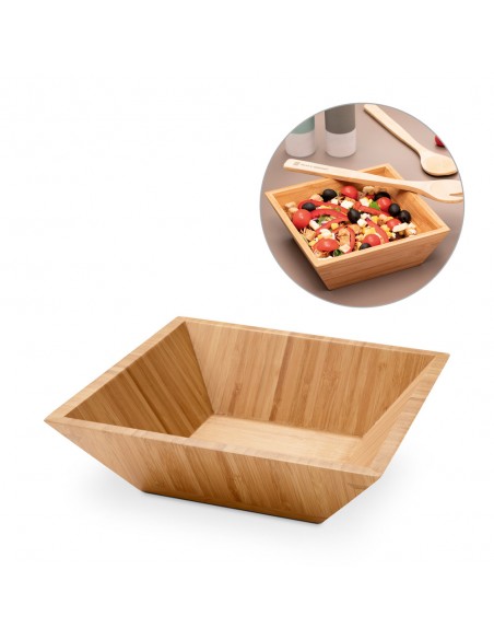 Saladeira em bambu em formato quadrado. Adicione o conjunto Salvy de 2 talheres para salada em bambu para compor este brinde ecológico.