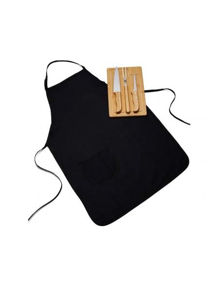 Acompanha avental preto, tábua para churrasco e tábua para caipirinha, pegador, socador em Bambu.