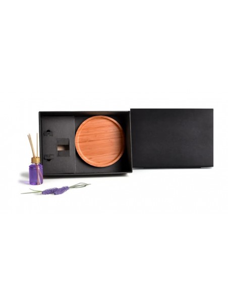 Kit para bandeja e aromatizador. Conta com bandeja redonda em bambu e aromatizador de ambiente com fragrância de lavanda.