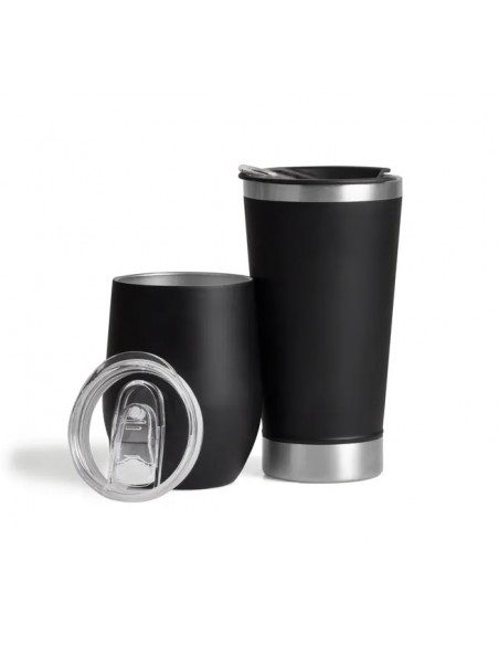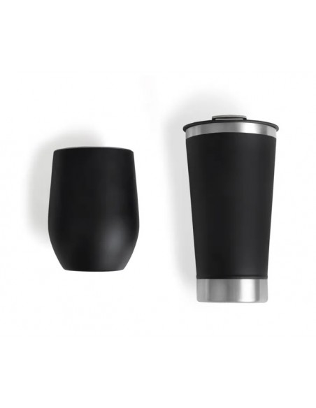 Kit de copos em Aço Inox. Copo térmico com tampa 340ml. Tampa com ótima vedação e trava no bocal para melhor higiene. Copo térmico com tampa e abridor de garrafa 500ml. Os dois contam com dupla parede de inox, isolada a vácuo para manter a temperatura por mais tempo.