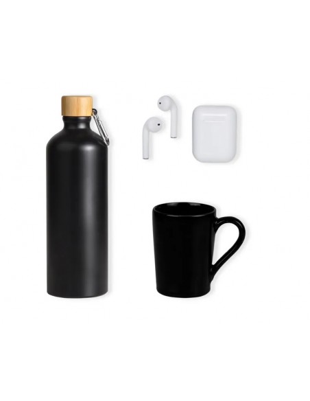 Conta com garrafa, caneca em cerâmica preta com capacidade 230 ml e fone de ouvido bluetooth.