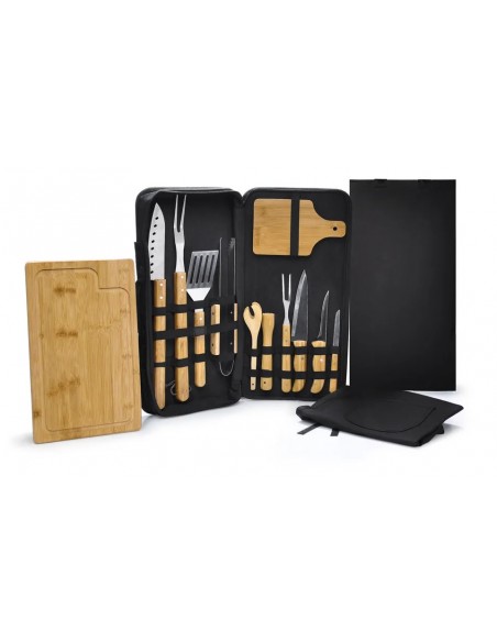 Acompanha avental preto, tábua para churrasco e tábua para caipirinha, pegador, socador em Bambu.