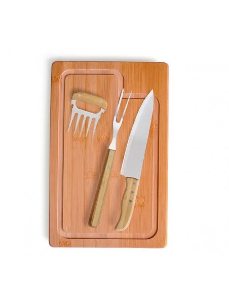 Conjunto composto por uma tábua retangular em tripla camada invertida de Bambu com sulco e duas peças com cabos em Bambu e lâminas em Aço Inox.