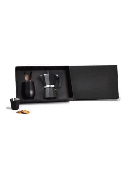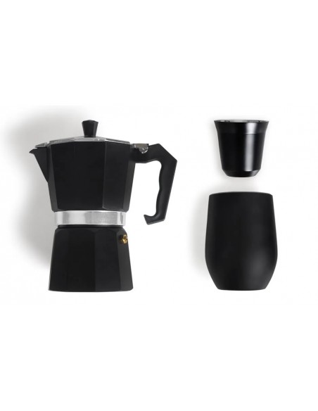Kit para café. Conta com cafeteira prensa francesa e dois copos para café em aço inox preto, um de 80ml e outro de 340ml com tampa