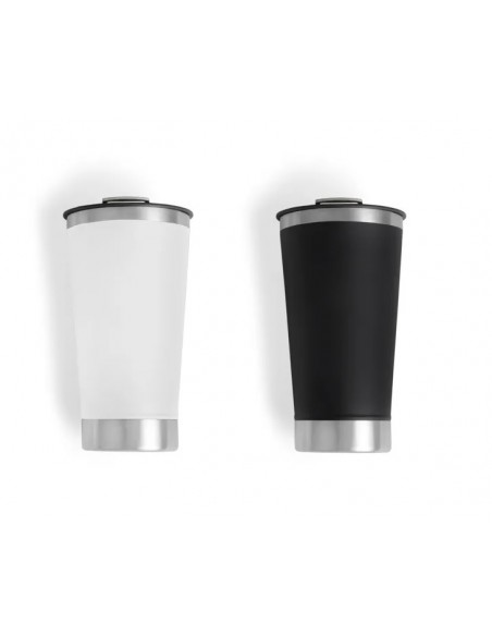 Kit de copos 500ml cada. Conta com dois copos térmicos, um preto e um branco, com tampa e abridor de garrafa. Confeccionados com dupla parede de inox, isolada a vácuo. Conservação aproximada líquidos quentes: 1h / Conservação aproximada líquidos gelados: 7h / Conservação aproximada líquidos com gelo: 15h Ideal para bebidas geladas ou quentes.