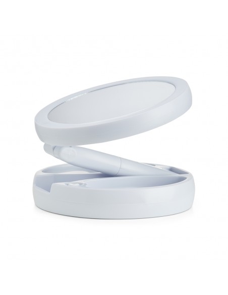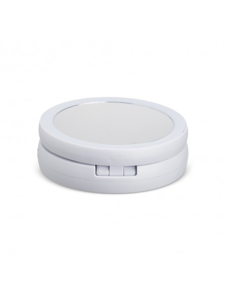 Espelho Dobrável com LED Recarregável e dupla face, material plástico. O espelho possui uma das faces ampliada 10x e do outro lado, espelho convencional 1x, iluminação LED dos dois lados, três compartimentos na base para armazenamento de acessórios, espelho giratório e regulável, botão liga/desliga e botão para acionar a iluminação, com funcionamento à base de 4 pilhas AA ou via cabo USB. Acompanha antiderrapantes emborrachados.