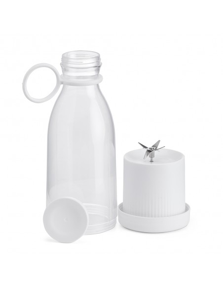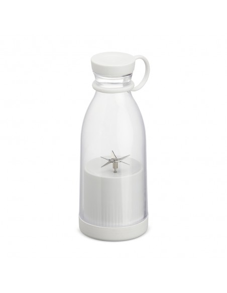 Mini liquidificador portátil com capacidade de 380ml. Contém tampa rosqueável plástica com alça emborrachada para transporte, ventoinha inox 6 lâminas e base plástica com borrachas antiderrapantes. Acompanha cabo USB. Obs. (Para o funcionamento do produto a quantidade total de frutas/água adicionadas não deve exceder 300ml).
