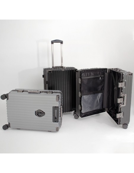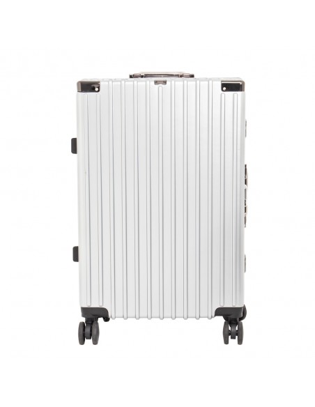 Mala de viagem 78 litros feita em plástico com acabamento em alumínio, contém cadeado numérico TSA. Compartimentos internos com bolso telado, bolso plástico para itens molhados e cinta compressora para roupas. A mala possui duas alças de mãos, puxador retrátil com regulagem de tamanho e suporte para celular, suporte porta bolsa, suporte para copo ou garrafa, quatro rodinhas 360º e apoios laterais.