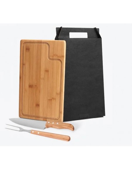 Conjunto composto por uma tábua retangular em tripla camada invertida de Bambu com sulco e duas peças com cabos em Bambu e lâminas em Aço Inox com rebites resistentes, sendo uma faca 8” para carnes com gravação dos cortes do boi e um garfo trinchante. Produto ecológico.