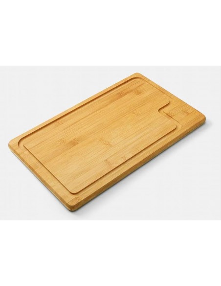 Conjunto composto por uma tábua retangular em tripla camada invertida de Bambu com sulco e duas peças com cabos em Bambu e lâminas em Aço Inox.