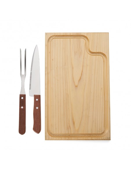 Kit churrasco três peças em estojo de papel kraft, contém: faca, garfo e tábua de corte com canaleta.