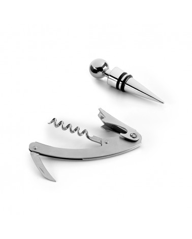 Saca-rolhas metálico com abridor de garrafas, lâmina para corte e rolha metálica.